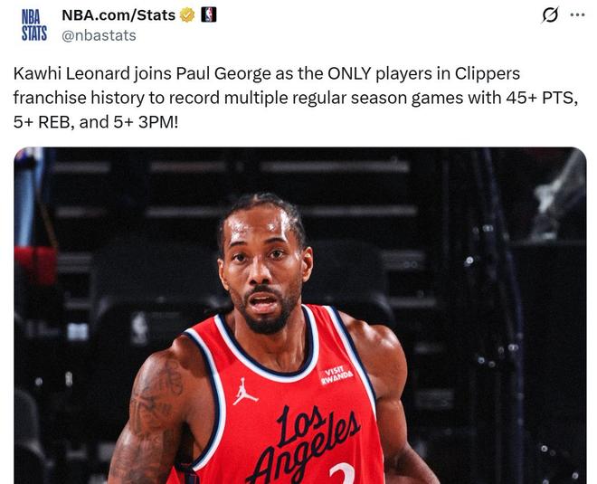 凭借这样的表现,小卡快船生涯第二次单场拿到至少45分5板5三分,成为快船队队史第二位交出这一表现的球员,第一位是乔治。